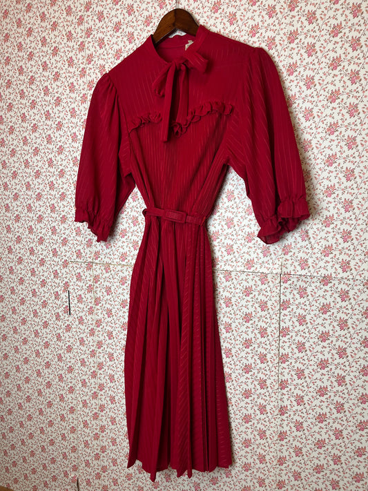 Vintage 1950s Pussy Bow Waist Tie Midi Dress in Red