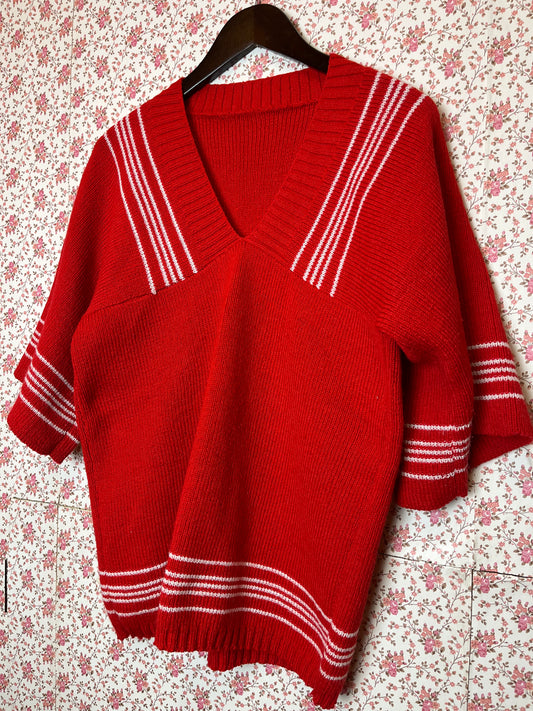 Vintage Original 1960s Hand Knitted Red Jumper Top with White Stripe