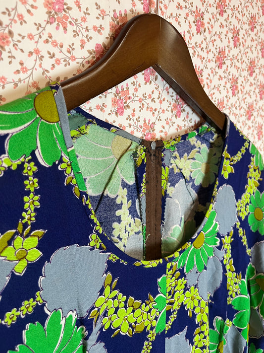 Vintage 1970s Handmade Long Sleeve Floral Maxi Dress in Blue & Green