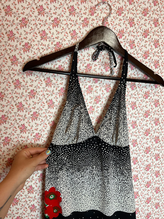 Vintage 1970s Hand Made Black White and Red Horizontal Halter Neck Dress