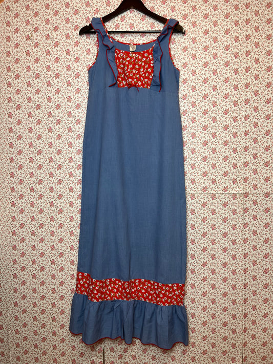 Vintage 1970s Denim Effect Sleeveless Maxi Prairie Dress