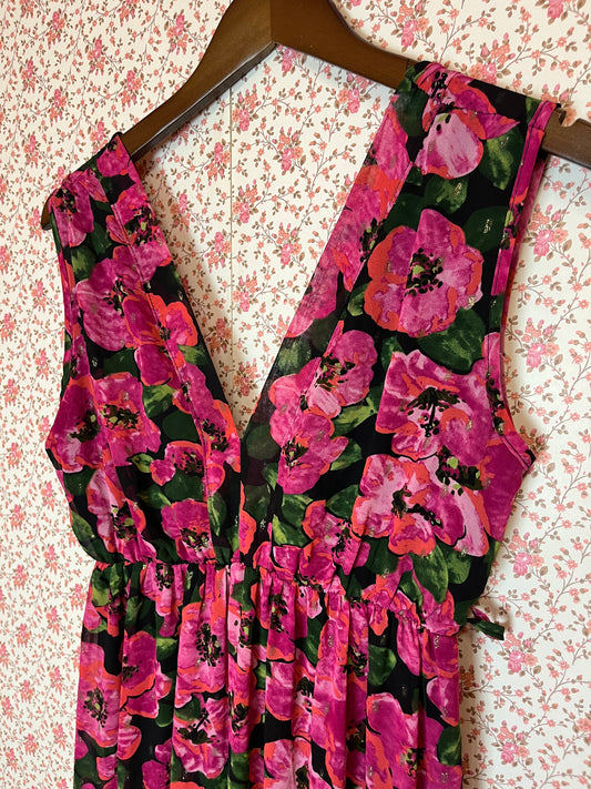 Vintage 1970s Black and Pink Floral V Neck Tiered Maxi Dress