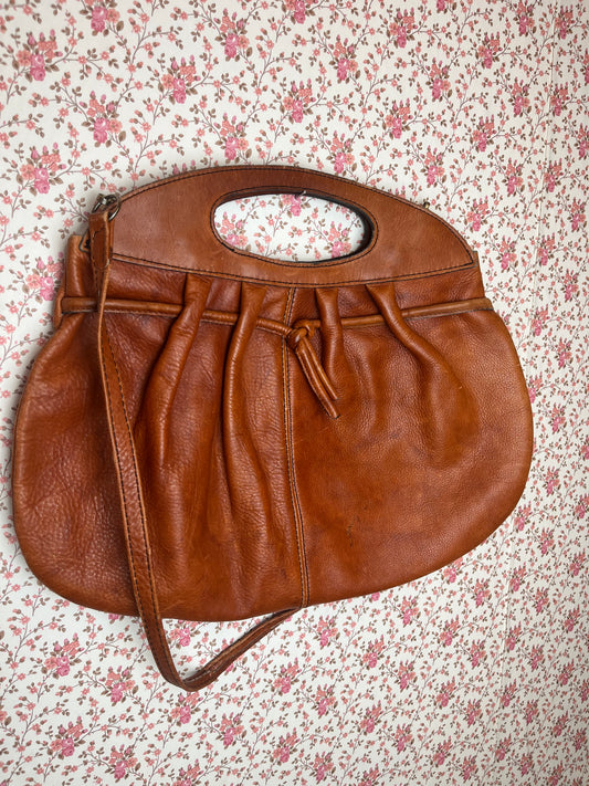 Vintage 1970s Brown Tan Pleated Leather Handbag with Shoulder Strap