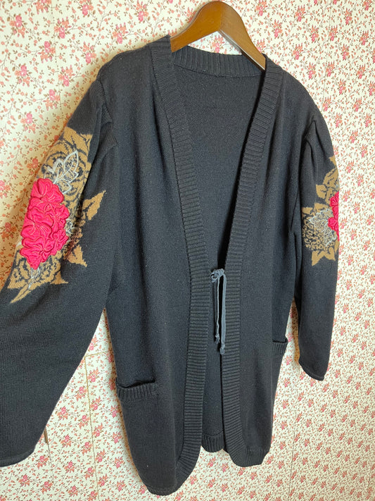 Vintage 1980s Patchwork Cardigan with Floral Decal and Tie Up
