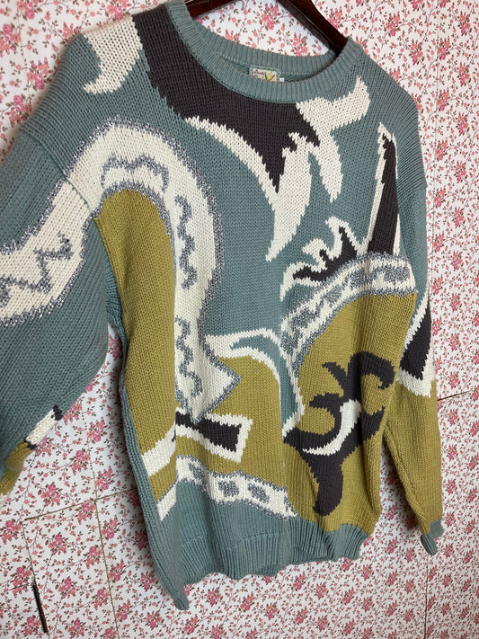 Vintage 1980s Blue & Yellow Abstract Pattern Knitted Cotton Jumper