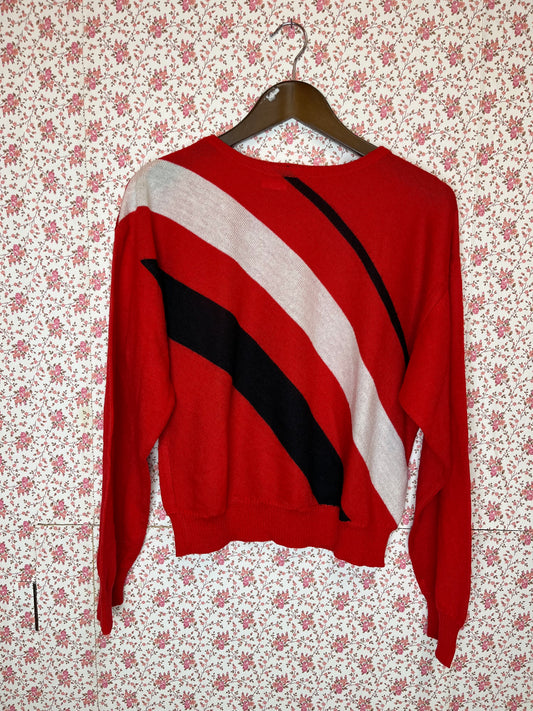 Vintage 1980s Red White and Black Striped Batwing Fine Knit Jumper