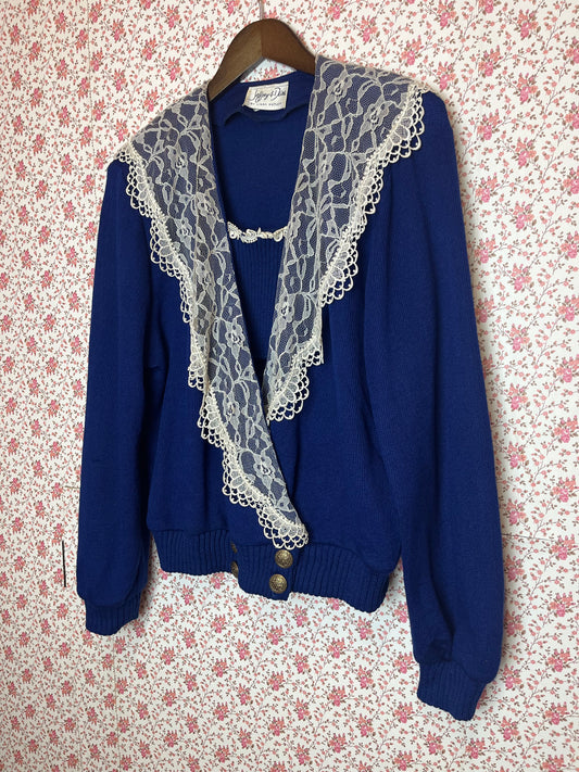 Vintage 1980s Blue Fine Knit Cardigan with Lac