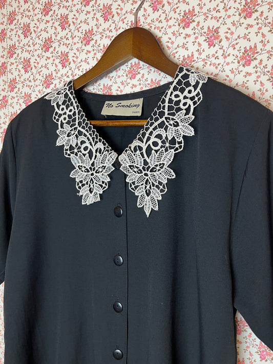 Vintage Appliqué Lace Black Short Sleeve Shirt