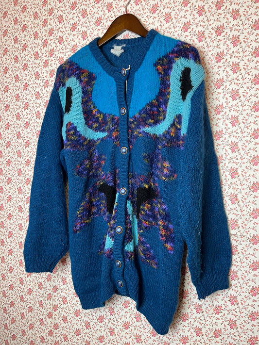 Vintage 1980s Abstract Pattern Blue and Multi Colour Knitted Cardigan