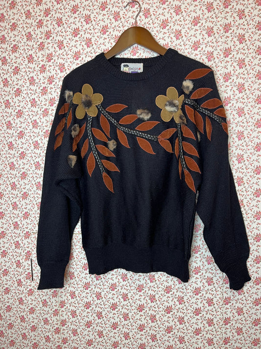 Vintage 1980s Autumn Appliqué Jumper with Leather and Fur