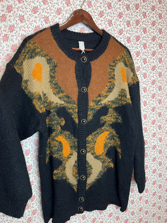 Vintage 1980s Abstract Pattern Black & Brown Knitted Mohair Cardigan