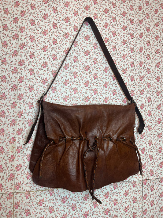 Vintage 1970s Brown Leather Pleated Satchel Bag