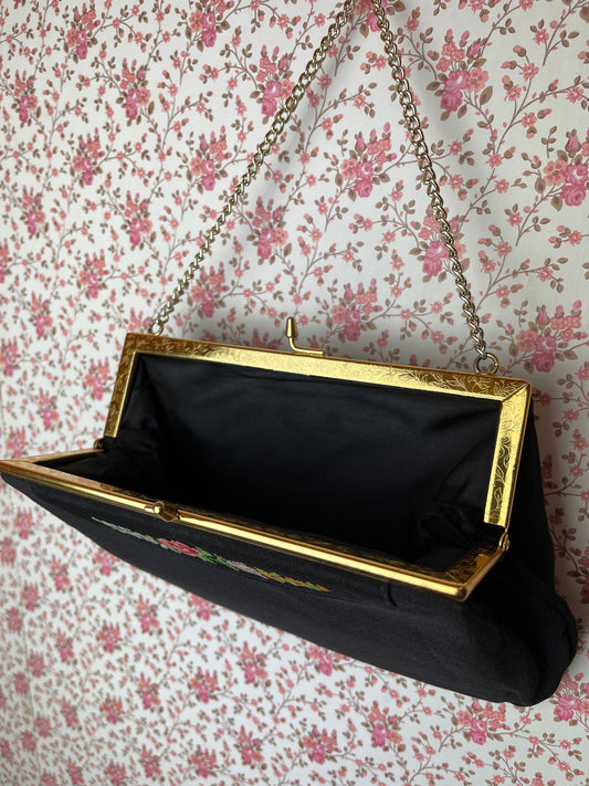 Vintage 1950s Crosstitch Embroidered Black Evening Bag
