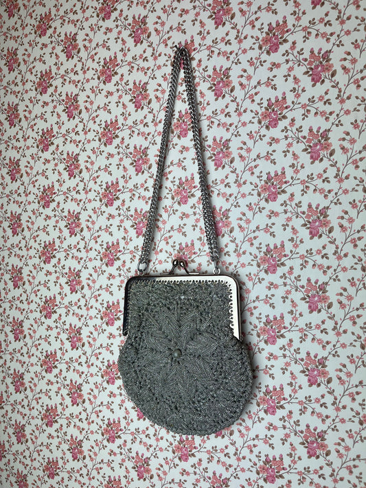 Vintage 1970s Original Hand Made Silver ‘Snowflake’ Crochet Evening Bag