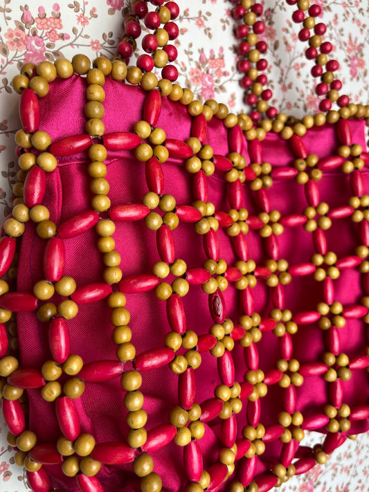Vintage Wooden Beaded Hot Pink Hand Bag