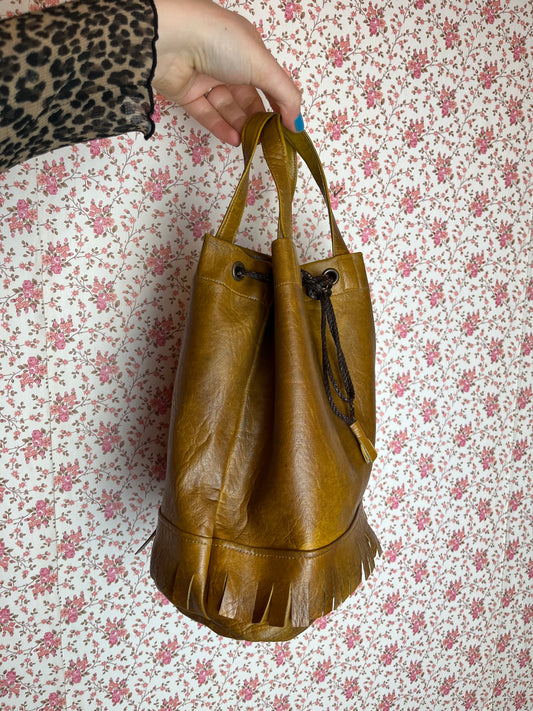 Vintage 1970s Ochre Leather Bucket Bag with Tassels
