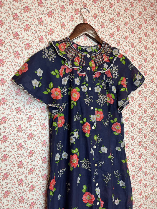 • Vintage 1970s Smocked Floral Maxi Shirt Dress