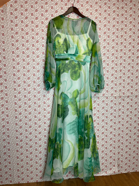 Vintage 1960s Abstract Green Chiffon Long Sleeve Maxi Princess Dress
