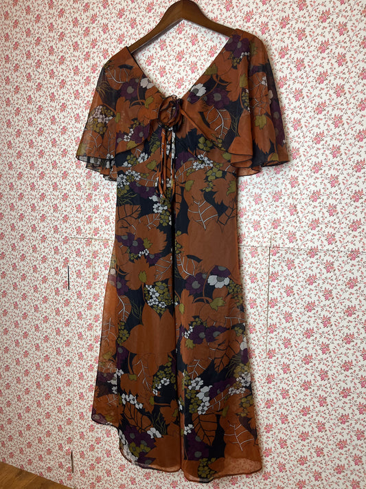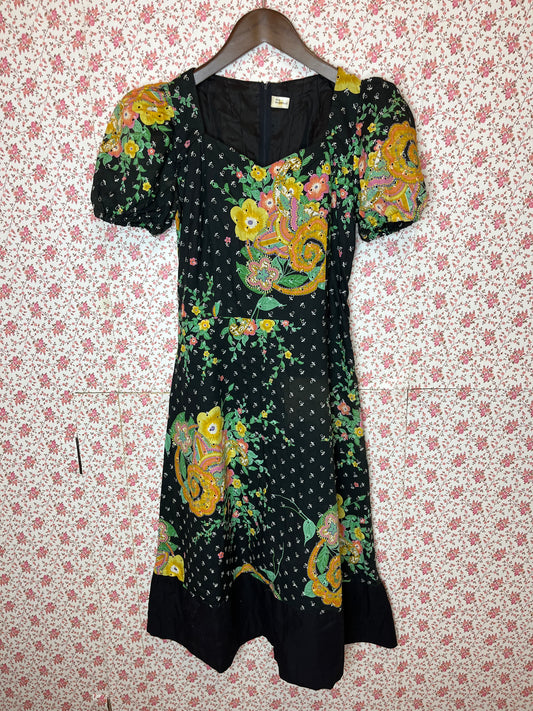 Vintage 1970s Carnegie Floral Print V Neck Midi Dress in Black & Brown