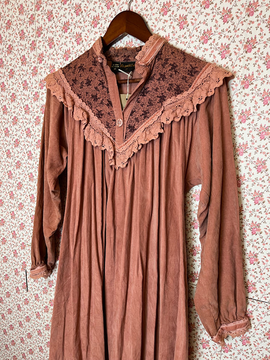 Vintage 1970s Style Dusty Pink Corduroy Midi Smock Dress with Frill Yoke and Tie Up