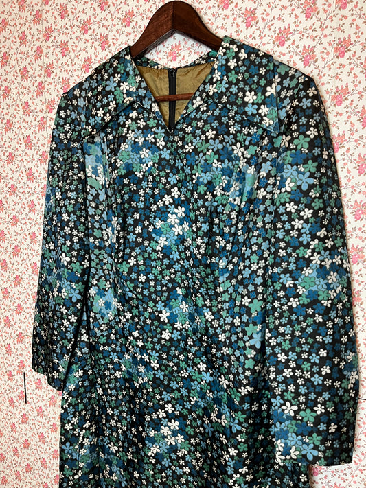 Vintage 1970s Handmade Floral Blue and Black Dagger Collar Shift Dress