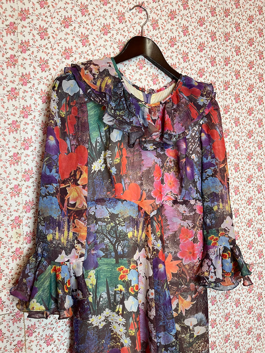 Vintage 1970s Hand Made Photographic Floral Print Frilled Maxi Dress