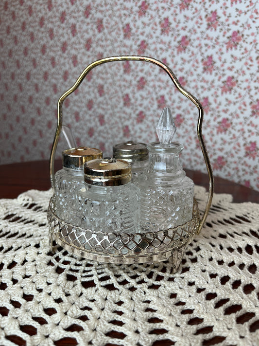 • Vintage 1960s Mayell Silver Plated Queen Anne Glass and Chrome Cruet Set
