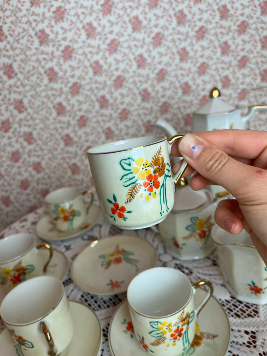 • Vintage Hand Painted Miniature Ceramic Tea Pot Cup & Saucer Set of 15