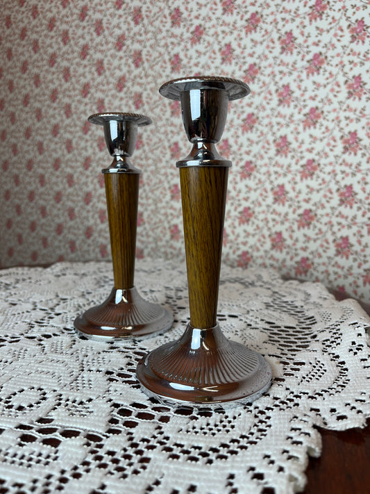 Vintage Mid-Century Wood Effect Chrome Candlestick Holders
