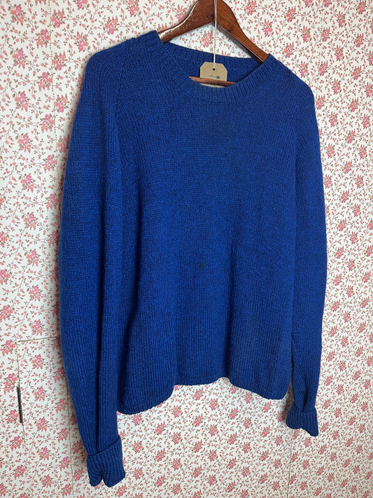 Vintage Hand Knitted Blue Wool Crew Neck Jumper