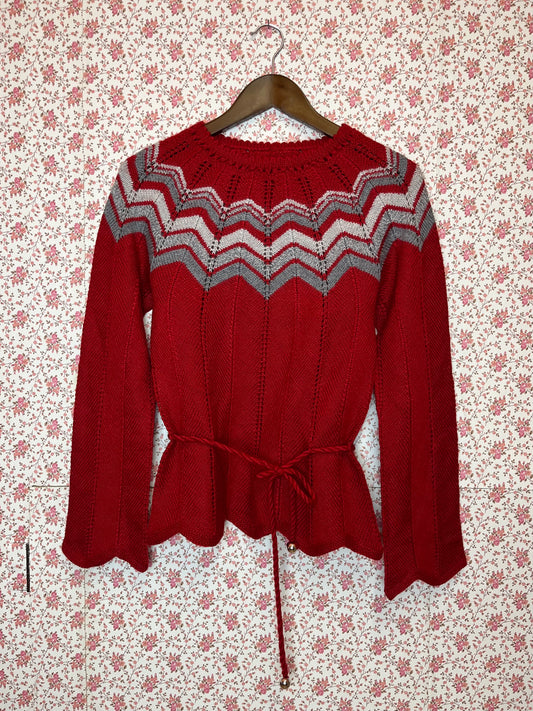 Stunning Vintage 1970s Hand Knitted Red Jumper with Zig Zag and Tie Up