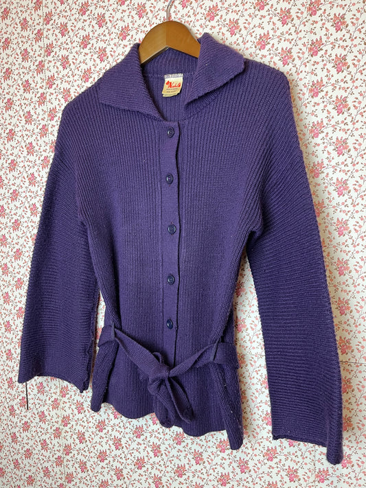 Vintage 1970s Wahls Knitted Ribbed Purple Cardigan with Tie