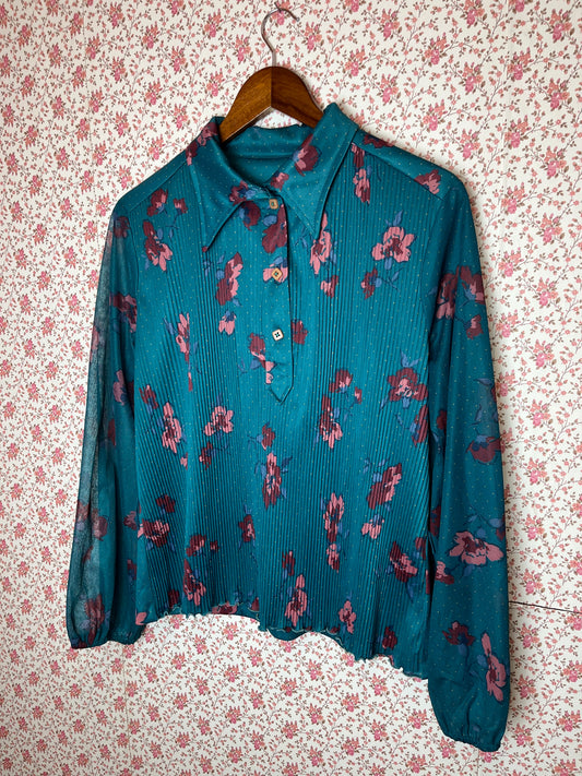 Vintage 1970s Hand Made Teal Plisse Floral Popover Shirt