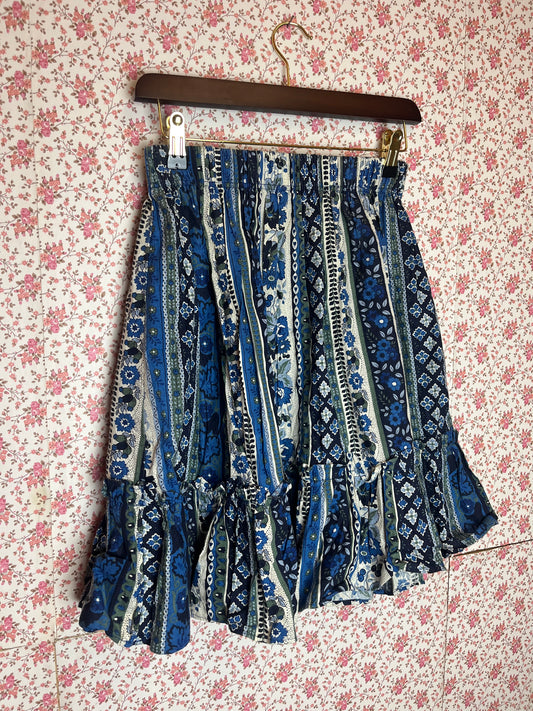 Vintage Blue & White Floral Striped Mini Skirt with Frill