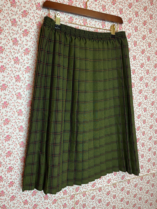 Vintage 1970s Green Checked Pleated Midi Skirt