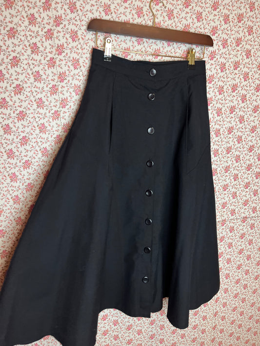Vintage 1960s Black Full A Line Midi Skirt with Buttons and Pockets