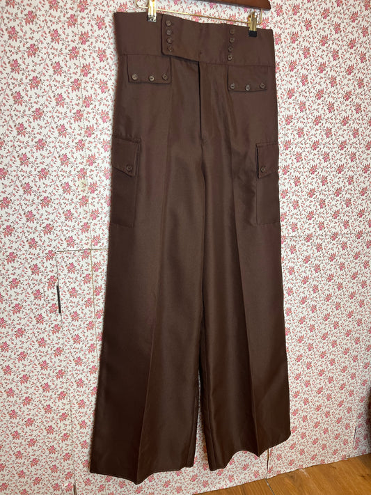 Vintage 1970s Ultra High Waist Brown Wide Leg Trousers with Pockets & Buttons