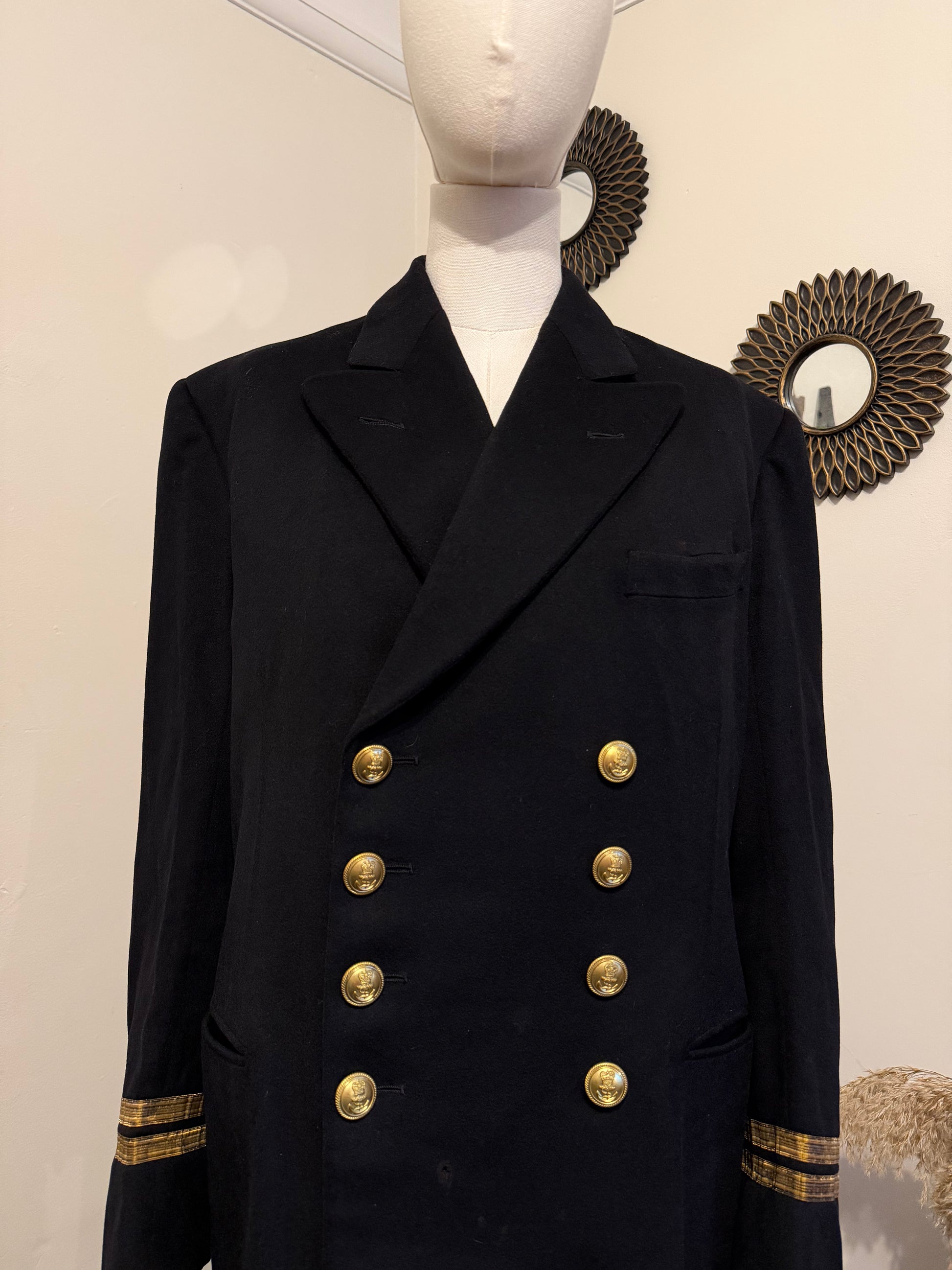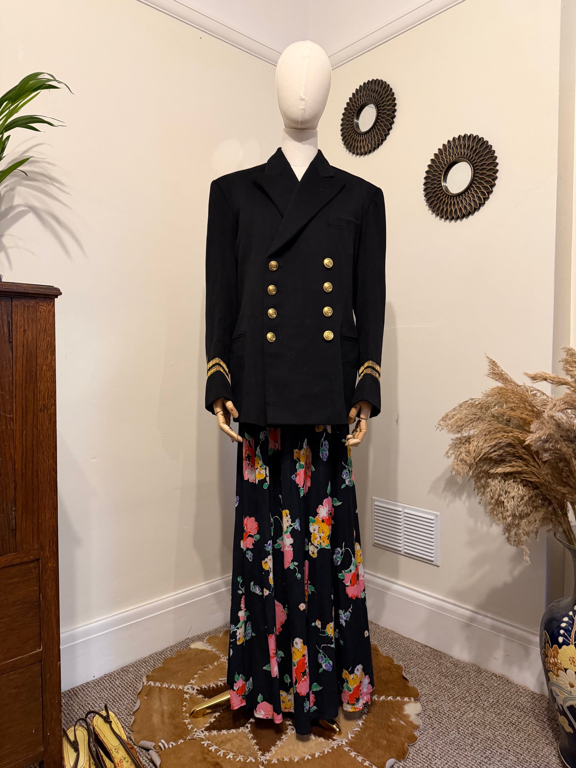 Own an iconic piece of British history. Complete with gold Lieutenant rank curls on the cuffs and anchor insignia buttons. Made from a heavy, soft brushed doeskin black wool, lined with a synthetic satin. Featuring a top pocket, 2 welt pockets at either sides, one with a separate key pocket inside, and 2 inside pockets. Sharp notched lapels and double breasted fastenings. Entirely hand finished.