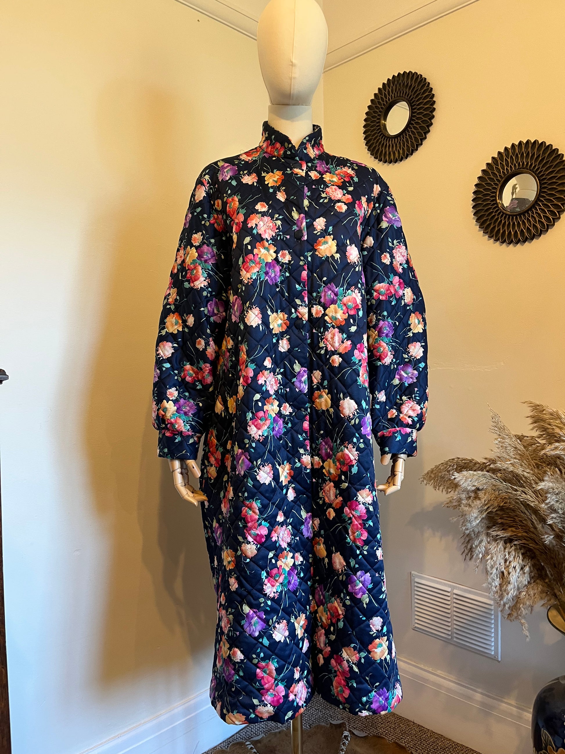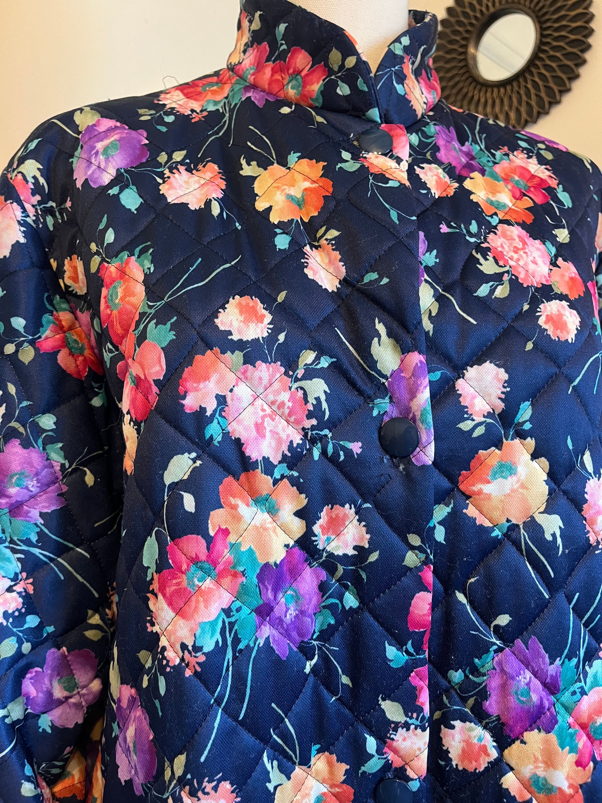 - Floral patterned quilted design, in shades of midnight blue, purple, green, pink and oranges